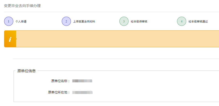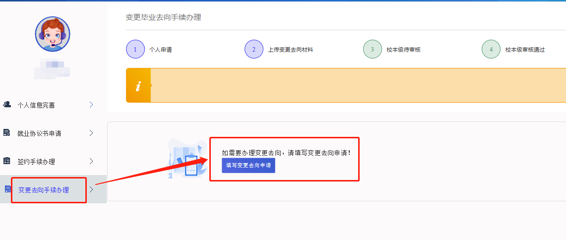 第二步:选择“变更去向手续办理”功能,并点击“填写变更去向申请”。